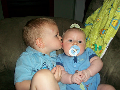 Jackson is healthy and happy. He is 27 inches long and 18 LBS 12oz. That is 90% weight, 94% height. I forgot head circumference. The doctor asked if we have tall people in our family. I wanted to laugh, not really! Eric's brothers are only slightly taller than Eric. Brent being the tallest of all 4 at 6ft. Heaven knows I'm not tall, and Ham is average. So are both of our parents. I think when Jacks is 2 and Ty is 4 people are going to be asking me if they're twins! And Noel, sorry honey, despite being 4 1/2, you're still looking at least another year - probably more - until you can legally be in a booster seat in NYS where the requirements are 40LBS.